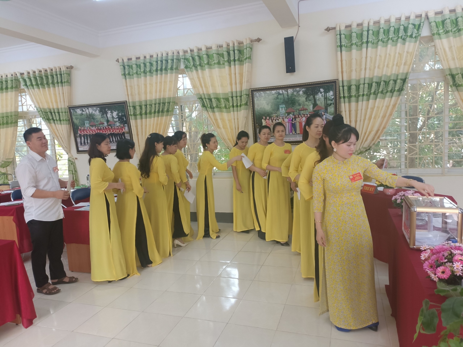 Ban chấp hành khóa IV, nhiệm kỳ 2023 – 2028 ra mắt đại hội, Bà Đặng Thị Hải Yến – Hiệu trưởng nhà trường, cùng 03 tổ trưởng chuyên môn, văn phòng đã tặng hoa chúc mừng ban chấp hành khóa mới.